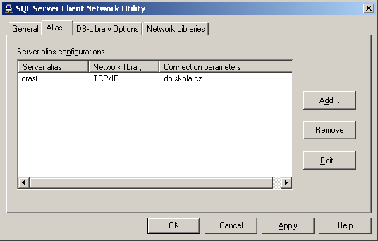 Konfigurace aliasu pro MsSql se provádí programem Client network utility: