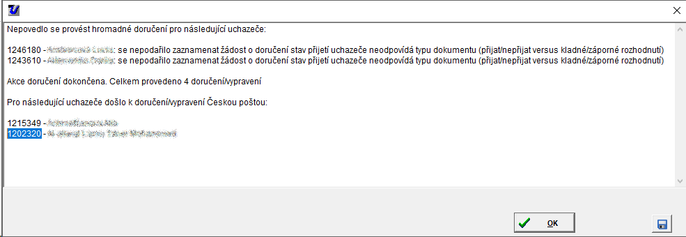 Při hromadném vypravení "českou poštou" je v případě, že uchazeč má datovou schránku (i když její ID není zaevidované v Osobních údajích studenta/uchazeče), je u něj vypravení přeskočeno.