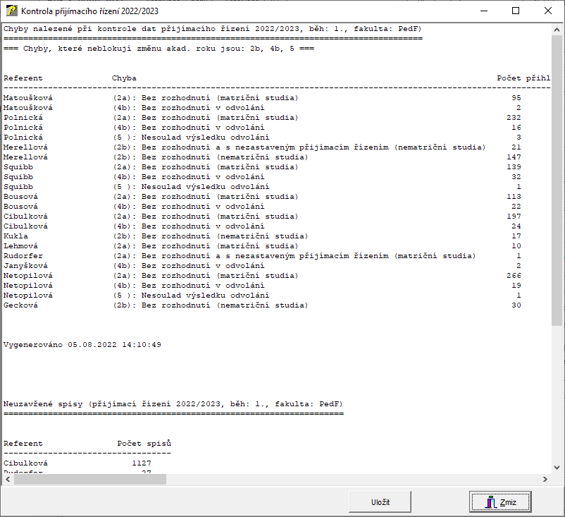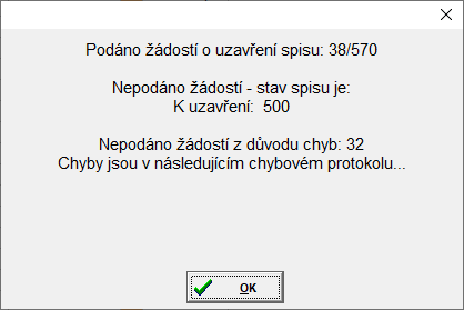 - Pokud se při kontrole najdou vážné chyby (ostatní než uvedené výše), program po podání žádostí o uzavření spisu zobrazí chybový protokol s počty jednotlivých chyb dle referentů.